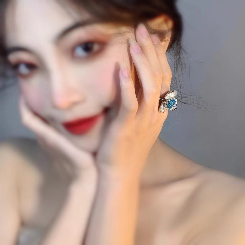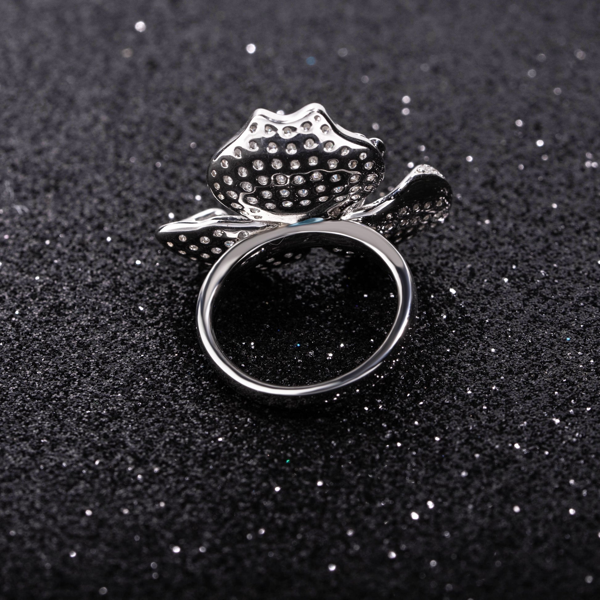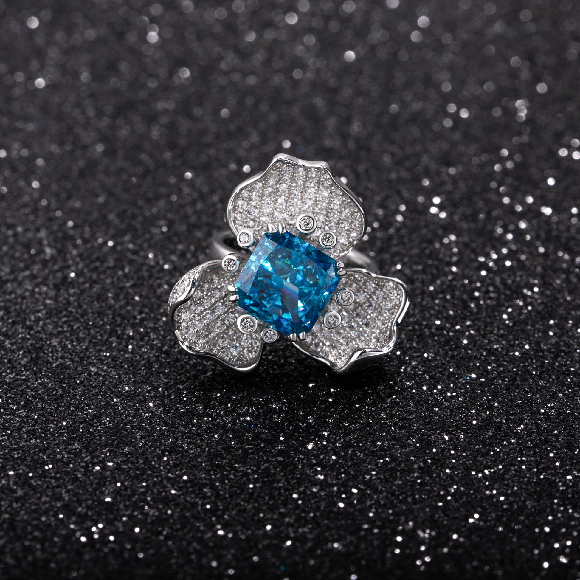 Radiant Cut Blue Zircon Flower Shape Designer Ring in Sterling Sliver Plated White Gold